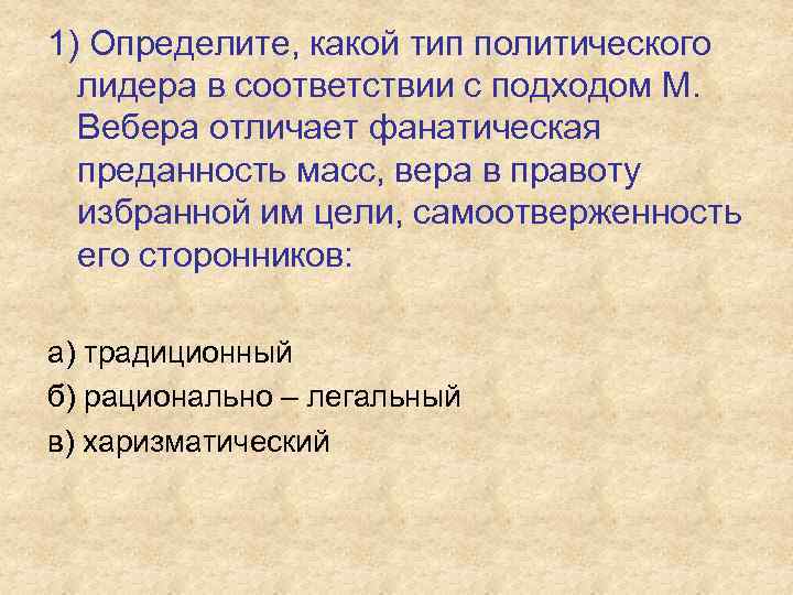 1) Определите, какой тип политического лидера в соответствии с подходом М. Вебера отличает фанатическая преданность масс, вера в правоту избранной им цели, самоотверженность его сторонников: а) традиционный б) рационально – легальный в) харизматический