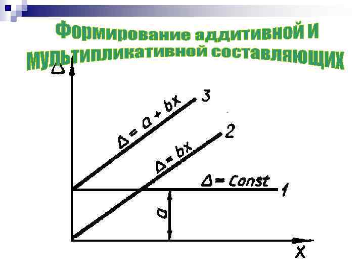 n Абсолютная погрешность —разность между показанием х СИ и действительным значением хд измеряемой величины Абсолютная погрешность выражается в единицах измеряемой ФВ и может быть задана: а) одним числом (линия 1 на рис. 3): ∆ = ±a; б) в виде линейной зависимости (линии 2 и 3): ∆ = ±Ьх; ∆ = ± (а + Ьх); в) в виде функции ∆ =f(x) или графика, таблицы. . Если значение погрешности не изменяется во всем диапазоне измерения (линия 1), то такая погрешность называется аддитивной (или погрешностью нуля). n Если погрешность изменяется пропорционально измеряемой величине (линия 2), то ее называют мультипликативной. Относительная погрешность: n