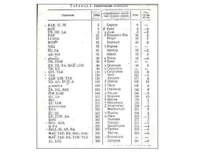 ДРЕВНЕЙШИЙ ЗВЕЗДНЫЙ «КАТАЛОГ» • В серию текстов «mul APIN» входил и древнейший из известных список звезд (своего рода звездный каталог): звезды Ану – 23 (приэкваториальные звезды), звезды Энлиля – 33 (севернее экватора) и звезды Эа – 15 (к югу от экватора). Они были скомпонованы в группы - созвездия, с которыми частично совпадают более поздние греческие, хотя они и отличаются по названию. ): LU. HUN. GA = Овен; MUL = Плеяды; SHU. GI= Персей (у вавилонян это "Старик" или "Колесничий"); SIBA. ZI. AN. NA = Орион ("Верный Пастух Небес"); MAR. GIB. DA (Повозка) = Б. Медведица, GIR. TAB = Скорпион, GUD. AN. NA (Бык Небес = Телец) и т. д. Но в то же время были и совсем отличные наименования созвездий: UZA (Коза) = Лира, APIN (Плуг).