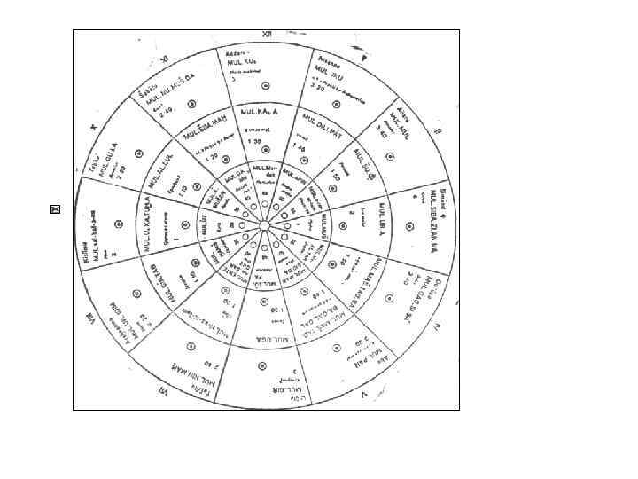 • Двенадцати месяцам сопоставлялись 36 выделенных звезд - по три на каждый месяц. Они располагались в виде трех колонок по 12 звезд – по числу месяцев, а в более старых Астролябиях по трем концентрическим поясам, разделенным на радиальные секторы – месяцы. Один пояс проходил по небесному экватору (звезды бога Ану), два других располагались к югу (звезды Эа) и к северу от него (звезды Энлиля). В секторах-месяцах отмечалась также изменяющаяся сезонно долгота дня (продолжительность ночной и дневной страж). «Служба» сезонных звезд существовала в городах Междуречья Ашшуре, Ниневии, Уруке, Вавилоне на протяжении целого тысячелетия. •