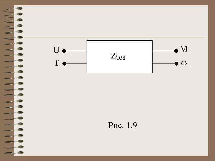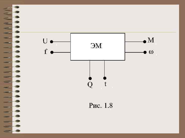 ЭМ (как ЭМП) можно представить как шестиполюсник (рис. 1. 8): с двумя электрическими выводами, характеризуемыми напряжением U и f , с двумя механическими выводами, определяемыми моментом М и частотой вращения , а также тепловыми – характеризуемыми количеством теплоты Q и температурой t.