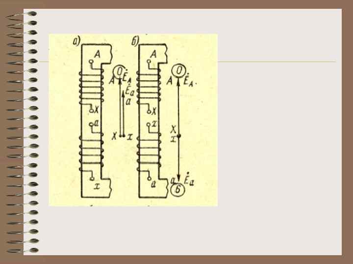 На рис. 2. 15 а показаны обмотки однофазного трансформатора, намотанные по левой винтовой линии и называемые поэтому «левыми» , причем у обеих обмоток начала А, а находятся сверху, а концы Х, х – снизу. Будем считать ЭДС положительной, если она действует от конца обмотки к ее началу. Обмотки на рис. 12. 15 а сцепляются с одним и тем же потоком.