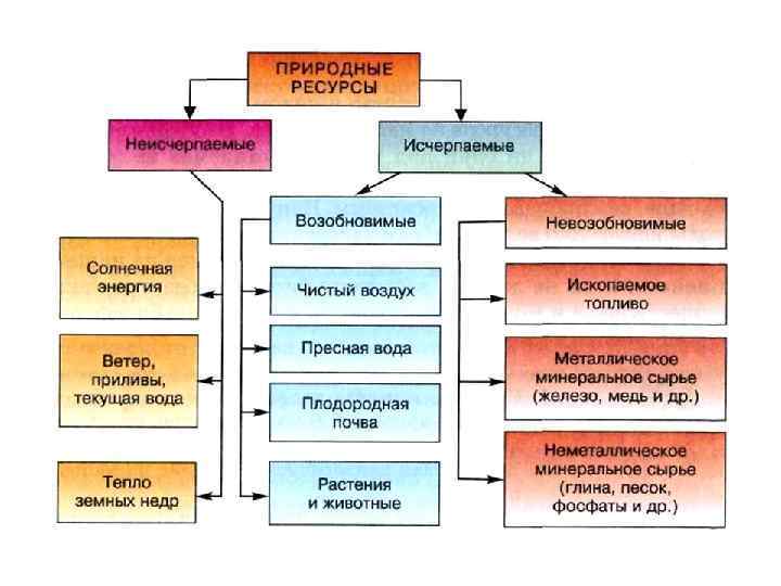 Ресурсы планеты Среди природных богатств неисчерпаемые ресурсы. планеты различают исчерпаемые и Неисчерпаемые ресурсы подразделяются на космические, климатические и водные. Это энергия солнечной радиации, морских волн, ветра. Выделение это относительно. Например, пресную воду уже можно рассматривать как ресурс исчерпаемый, поскольку во многих регионах земного шара возник острый дефицит воды. Можно говорить и о неравномерности ее распределения, и невозможности ее использования из-за загрязнения. Исчерпаемые ресурсы делятся на возобновимые и невозобновимые. Растительный и животный мир Земли, плодородие почвы относятся к возобновимым ресурсам с точки зрения человека. Использование огромного количества газа, нефти, угля, которые относятся к невозобновимым ресурсам, приведет к их исчерпанию в обозримом будущем и человечеству придется искать другие источники энергии. Причем несовершенная технология приводит к образованию большого количества отходов, к серьезному загрязнению атмосферы, почвы, воды.