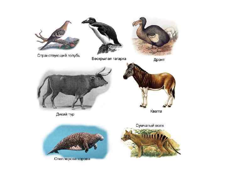 Влияние на живые организмы Потеря биоразнообразия. По вине человека происходит сокращение численности популяций многих видов, происходит и полное исчезновение видов. Одними из первых были уничтожены такие крупные животные, как мамонты, дикие туры. Тарпан, стеллерова корова, нелетающий голубь дронт, бескрылая гагарка, странствующий голубь и еще около 200 видов птиц и млекопитающих исчезли с лица Земли к 1900 году. Мы употребляем в пищу лишь около 50 видов растений, в то время как 75 тыс. растений имеют съедобные части и гораздо богаче питательными веществами, чем употребляемая сейчас растительная пища.