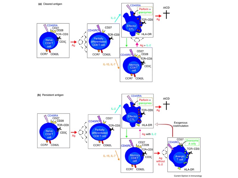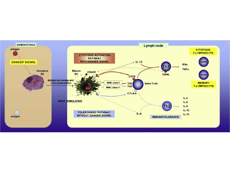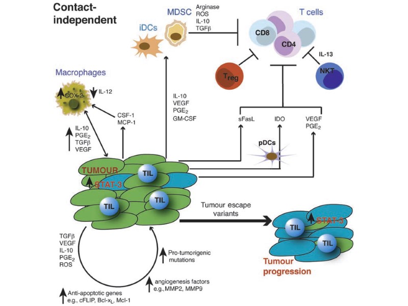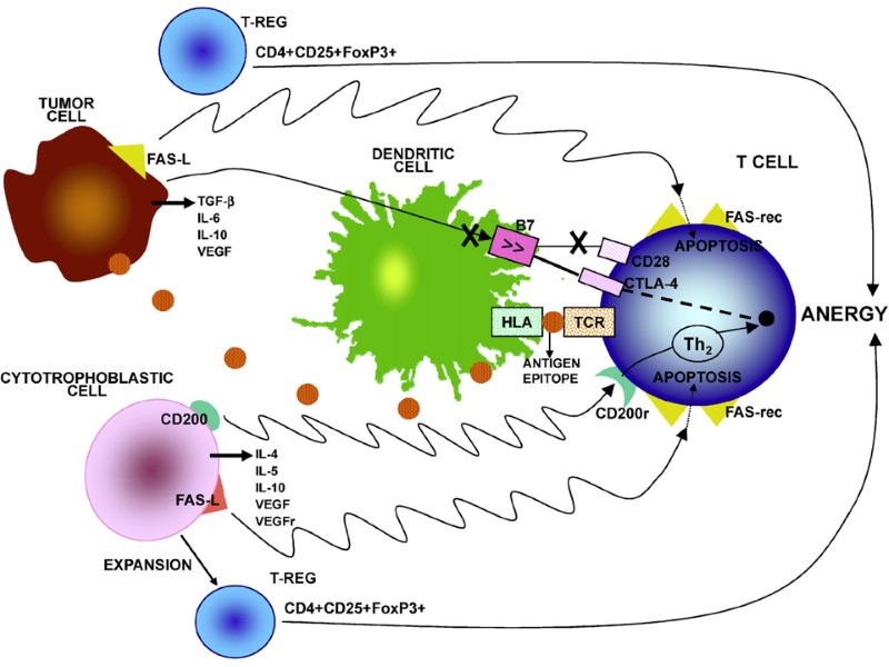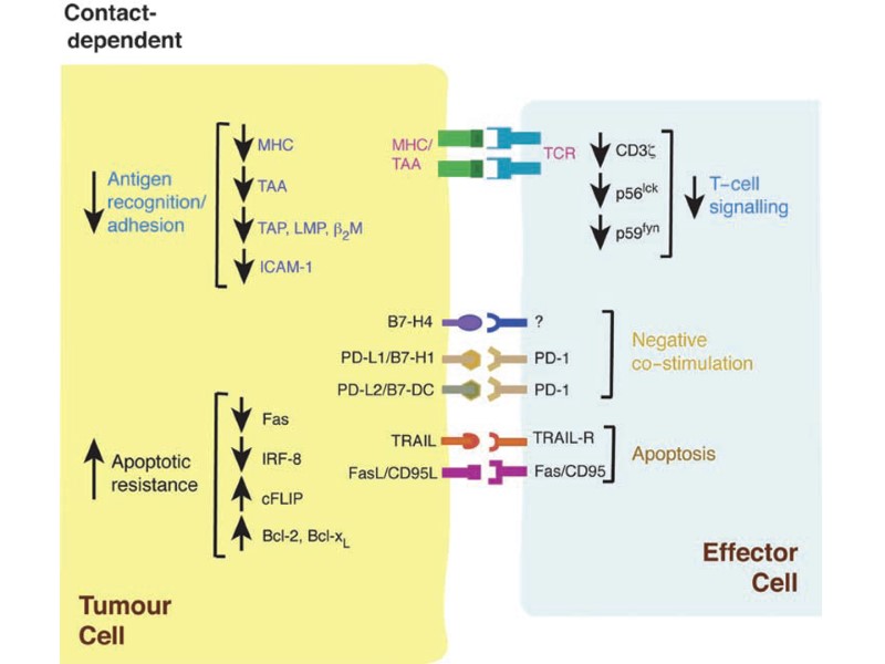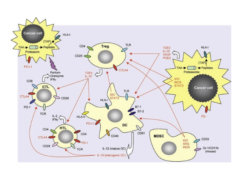 Опухолевый антиген может быть презентирован Т-клеткам различным образом. Непосредственная презентация антигена в отсутствие костимулирующих молекул, приводящая к анергии. Непосредственная презентация антигена на клетках опухоли, которые экспрессируют костимулирующие молекулы, приводит к активации Тц-клеток. Непосредственная презентация на опухолевых клетках и опосредованная презентация специализированными АПК, приводящая к активации и Тц- и Тх-клеток. Презентация опухолевого антигена клеткам иммунной системы