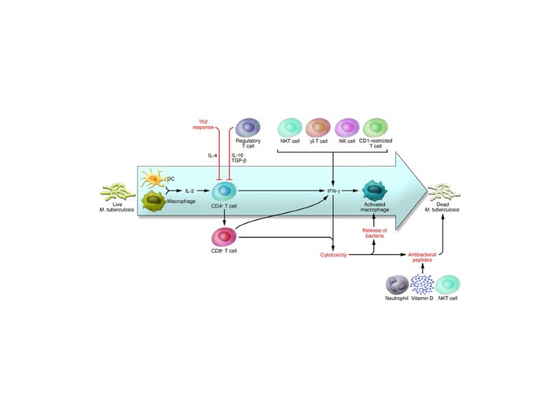 Delogu & Fadda – The Quest for a New Vaccine Against Tuberculosis 6 J Infect Developing Countries 2009; 3(1): 5-15. Номера в квадратах отражают различные стратегии, которые можно применить: Вакцина должна индуцировать сильный клеточный иммунный ответ, для которого характерно образование CD4+ и CD8+ Т-клеток, направленных против секретируемых и активно экспрессируемых в начале инфекции антигенов микобактерий. Быстрая мобилизация Т-лимфоцитов в месте инфекции, должна включать в себя бактериальную репликацию и снижение развития активного инфекционного процесса; Вакцинная стратегия, направленная на блокирование инфекции может быть основана на индукции антител, способных блокировать начальные стадии инфекции. Большинство лицензированных вакцин для человека работают подобным образом. Однако, пока не существует экспериментальных вакцин, для которых показано ингибирование микобактерий у животных; Стратегия иммунизации взрослых субъектов с латентной ТБ-инфекцией. Вакцина должна вызывать антимикобактериальный иммунный ответ у лиц, зараженных микобактериями, гарантируя контроль инфекции. Данную стратегию можно использовать для взрослого населения в странах, где ТБ является эндемичным; Естественный цикл развития туберкулеза и стадии инфекционного процесса, на которые возможно воздействие иммунного ответа, индуцированного вакциной 4) Вакцино-индуцированный иммунный ответ должен быть направлен на микобактериальные антигены, участвующие в диссеминации бактерий. Подавление диссеминации приводит к меньшему инфицированию различных органов и верхних долей легких, которые являются основным местом распространения микобактерий.