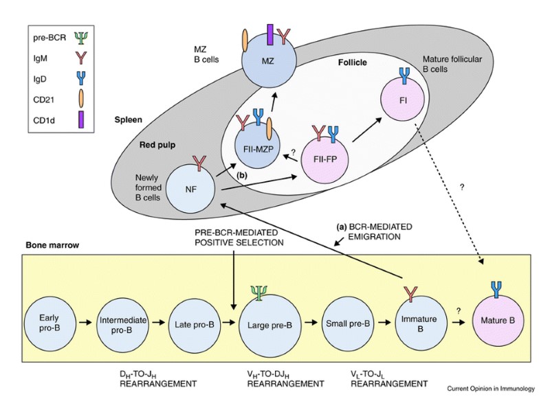 В-клетки активируются антигеном (Аг), представленным на антигенпрезентирующих клетках (АПК), например, макрофагах, в присутствии ИЛ-4 и ИЛ-1. Это индуцирует экспрессию рецепторов для ИЛ-2 и других цитокинов. ИЛ-2, ИЛ-4 и ИЛ-5 (у мыши) вызывают деление клеток. На рисунке показан только один цикл клеточного деления, хотя обычно клетки делятся многократно. На дифференцировку лимфоцитов в антителообразующие клетки (АОК) влияют ИЛ-4, ИЛ-5 (у мыши), ИЛ-6, ИЛ-10 и ИФН-γ. Стадии активации и развития В-клеток