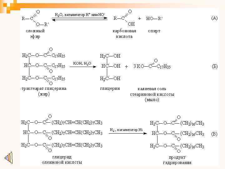 Химические свойства Наиболее характерно для эфиров карбоновых кислот гидролитическое (под действием воды) расщепление сложноэфирной связи, в нейтральной среде оно протекает медленно и заметно ускоряется в присутствии кислот или оснований, т. к. ионы Н+ и НО- катализируют этот процесс (рис. 2 А), причем гидроксильные ионы действуют более эффективно. Гидролиз в присутствии щелочей называют омылением. Если взять количество щелочи, достаточное для нейтрализации всей образующейся кислоты, то происходит полное омыление сложного эфира. Такой процесс проводят в промышленном масштабе, при этом получают глицерин и высшие карбоновые кислоты (C 15 -19) в виде солей щелочных металлов, представляющих собой мыло (рис. 2 Б). Продолжение темы –