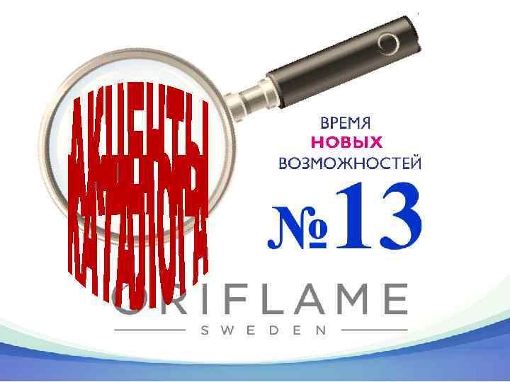 Акцент каталога № 13 РЕКРУТИРОВАНИЕ Ключ к осуществлению: - Кампания по приглашению «Искусство наслаждения жизнью» - Орифлэйм предлагает солидный и конкурентоспособный пакет возможностей, актуальный для текущей экономической ситуации Результат: - Пополнение и развитие ключевой команды - Рост Базы Активных Консультантов - Выполнение планов по росту и новым званиям - Успешная квалификация на мероприятия Орифлэйм