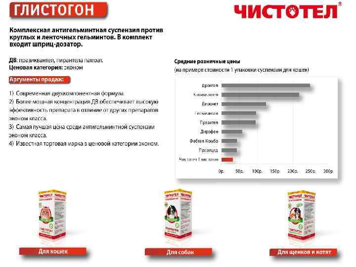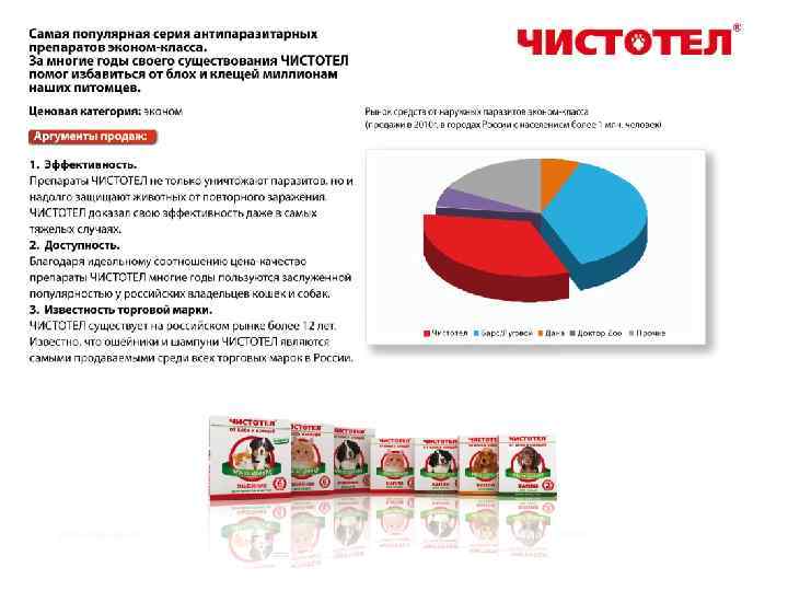 1. Самая известная торговая марка в сегменте эконом. Чистотел-народная марка от паразитов! 2. Запатентованная двухкомпонентная формула обеспечивает моментальный эффект и надолго защищает животное от повторного заражения. Препараты Чистотел подтвердили свою эффективность даже в самых запущенных случаях. Доказано- Чистотел работает безотказно! 3. Самая демократичная цена из препаратов на фипрониле. 4. Всегда есть новинки! Мы очень высоко ценим наших покупателей. И каждый год мы готовим для них новые товары, интересные конкурсы и ценные подарки!