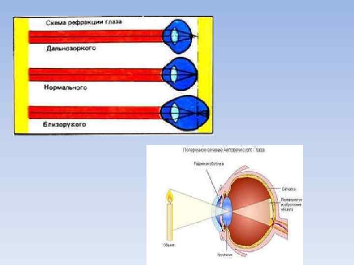 Механизм работы оптической системы глаза. Отраженные от предмета лучи света проходят через оптическую систему глаза и создают обратное и уменьшенное изображение на сетчатке (мозг «переворачивает» обратное изображение, и оно воспринимается как прямое).