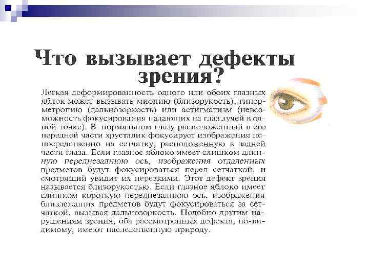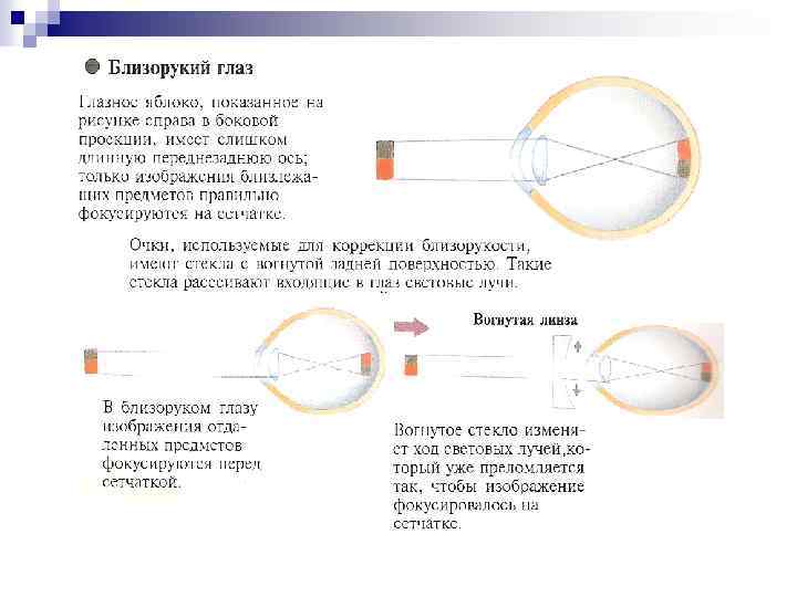 n Близорукий человек видит предметы размытыми, так как изображение формируется хрусталиком перед сетчаткой; точно также дальнозоркий человек видит нечёткое изображение, потому что оно формируется в его глазу за сетчаткой. Это может быть связано с изменением формы глазного яблока – оно становится соответственно или более вытянутым, или уплощённым. Исправить недостатки зрения можно при помощи собирающей или рассеивающей линзы (очков).
