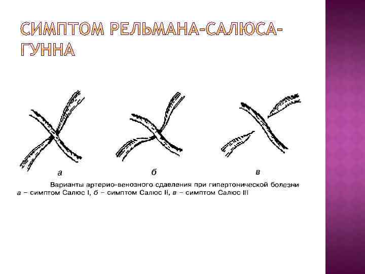 Гипертоническая ангиопатия сетчатки (сужение артерий и расширение вен у 85% больных) Гипертонический ангиосклероз сетчатки -симптом медной и серебряной проволоки -симптом Рельмана-Гунна-Салюcа I, III Частота всех симптомов от 20% до 50%