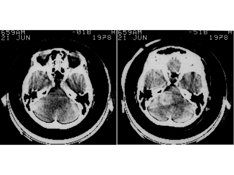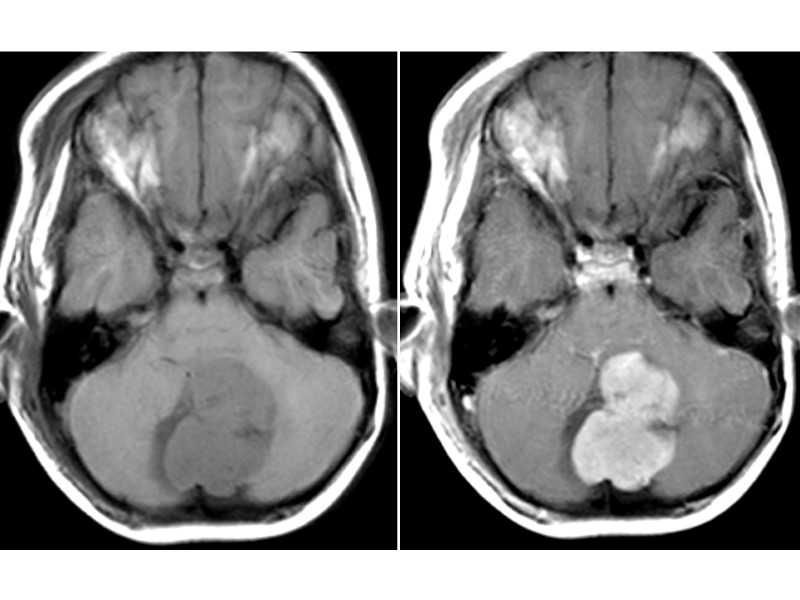 Эпендимома 4-го желудочка (до - слева и после - справа, контрастного усиления)