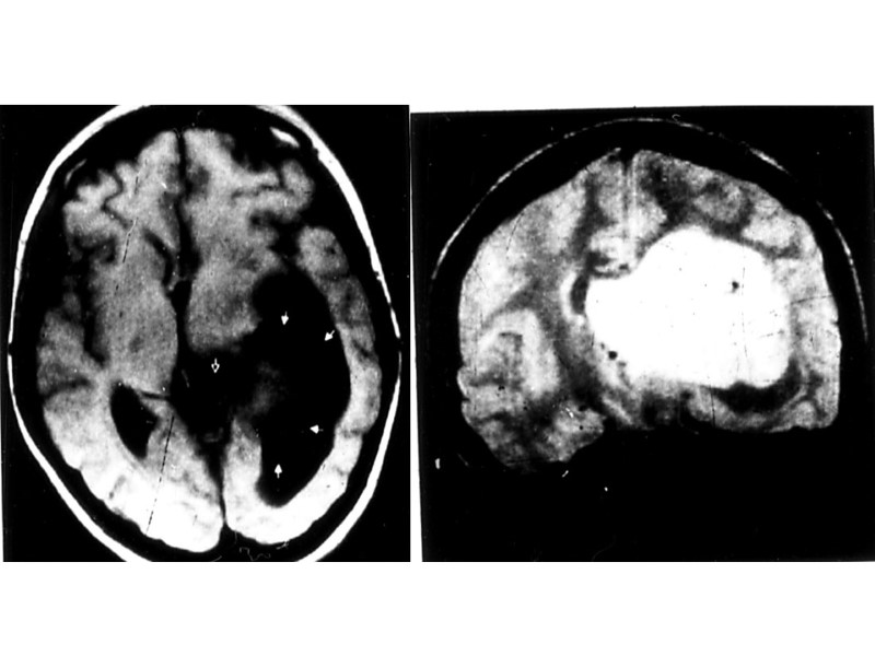 Анапластическая эпендимома (Т2-ВИ - слева, Т1-ВИ - справа)