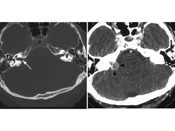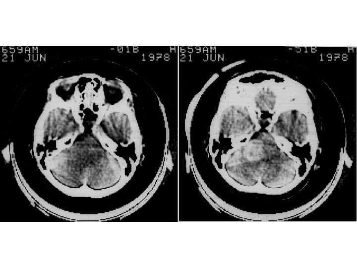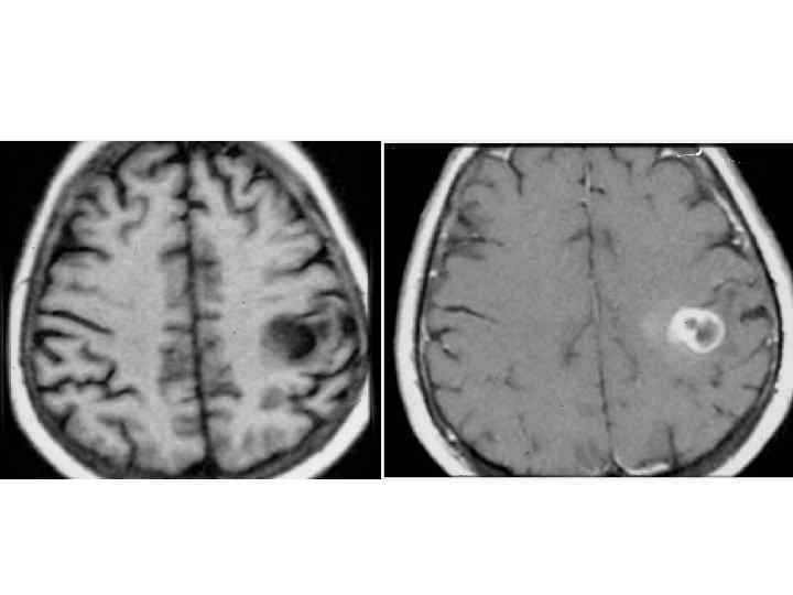 Кальцифицированная эпендимома (до слева и после - справа, контрастного усиления)