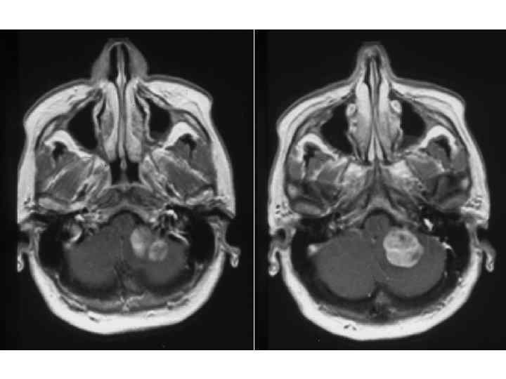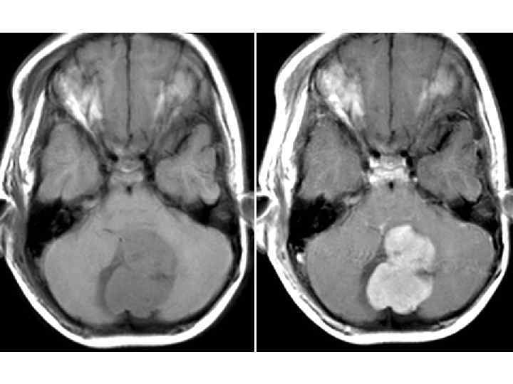 Эпендимома 4 -го желудочка (до - слева и после справа, контрастного усиления)