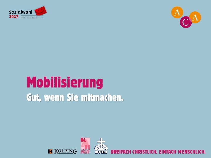 Gliederung I. Soziale Selbstverwaltung und Sozialwahlen 2017 II. ACA § Selbstverständnis § Wahlprogramm III. Mobilisierung