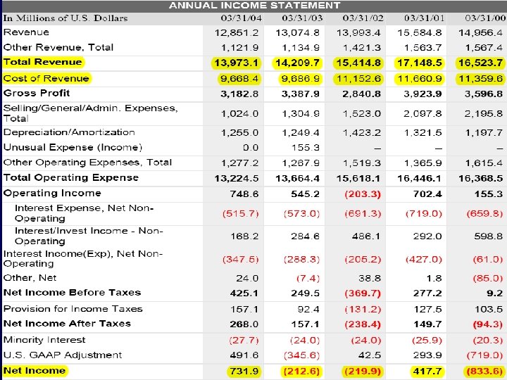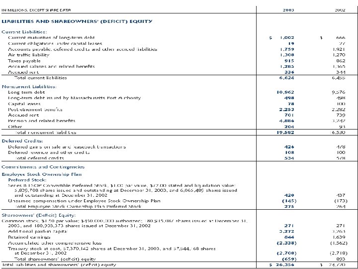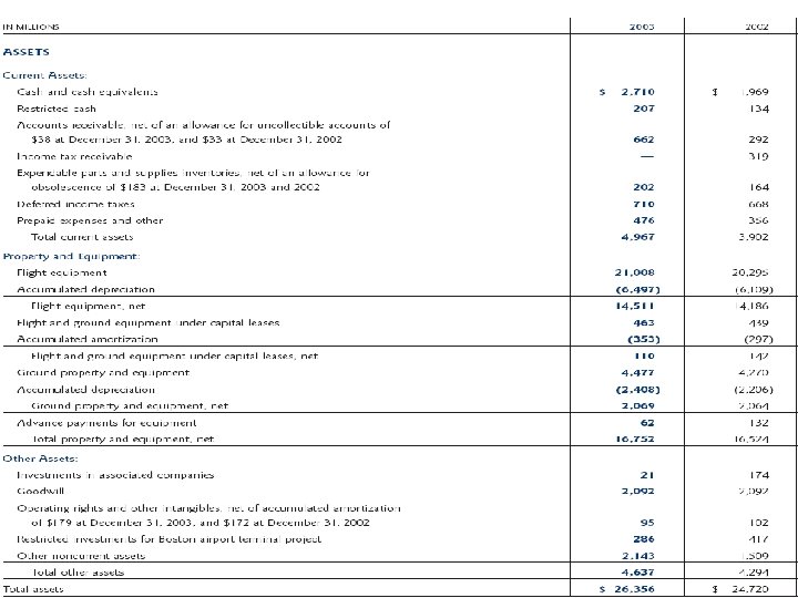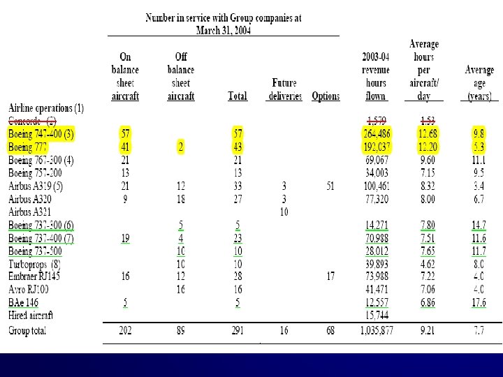 Performance Factors (% from ’ 02 to ’ 03) v v v Operating revenues: $13, 303 ( ) Operating expenses: $14, 089 ( 3. 6%) Operating margin: -5. 9% ( 3. 9 pt) Net earning (loss): -$773 ( 40. 06%) Opt revenue per available seat mile: 9. 90¢ ( 5. 4%) Opt cost per available seat mile: 10. 48¢ ( 1. 6%) Passenger load factor: 73. 4% ( 1. 4 pt) Breakeven passenger load factor: 78. 1% ( 1. 5 pt) Cargo ton mile yiled: 33. 08¢ ( 8. 0%) Avg aircraft fuel price per gallon: 81. 78¢ ( 22. 2%) End of yr full-time equivalent employees: 70, 600 ( 6. 0%)