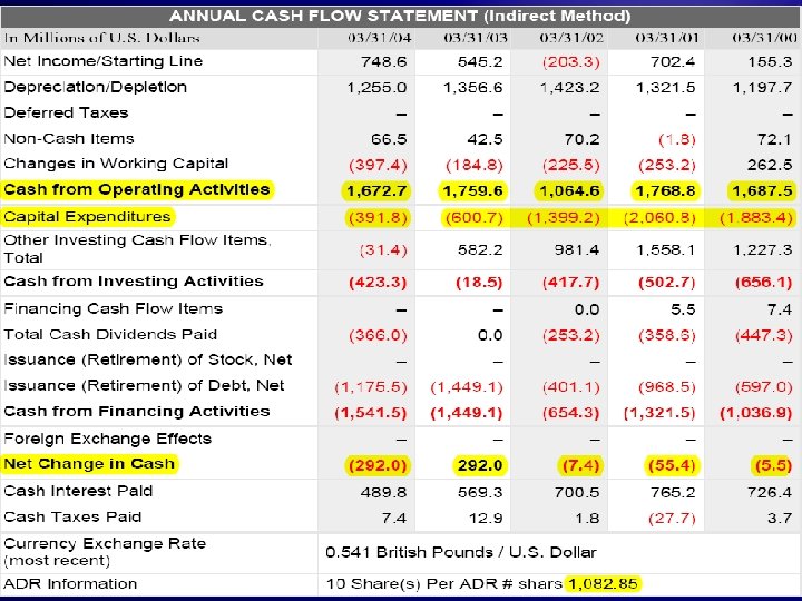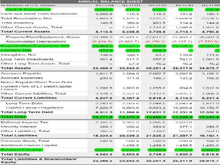 Cash Flow Statement Yr ending 2003 2002 2001 Beg. Balance 1, 969 2, 210 1, 364 Operating Act 453 285 236 Investing Act (260) (1, 109) (2, 696) Financing Act 548 583 3, 306 End. Balance 2, 710 1, 969 2, 210 Free Cash per share (’ 03) = $1. 54