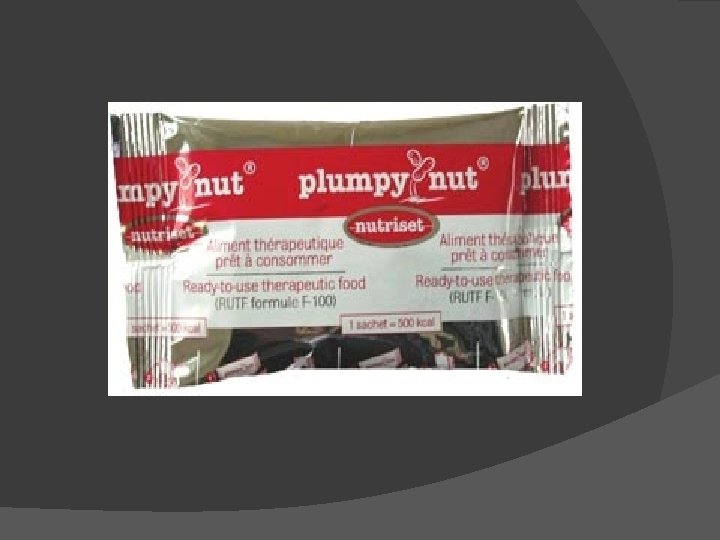 RUTF= Ready to Use Therapeutic Food Energy dense mineral/vitamin enriched food Peanuts, milk powder, sugar, oil + mineral/vitamin mix Easily consumed by children > 6 mo age 23 k. J/g (5. 5 kcal/g)/ 500 kcal/pk (92 g) BID x 4 -6 wks Equivalent in formulation to F 100 Promotes faster rate recovery from SAM Oil based w/ low water activity Microbiologically safe (pt w/ HIV, chronically ill) Stores for several months Eaten uncooked, soft/crushable Ideal for micronutrient delivery (heat labile) ↓ labor, fuel, water demands