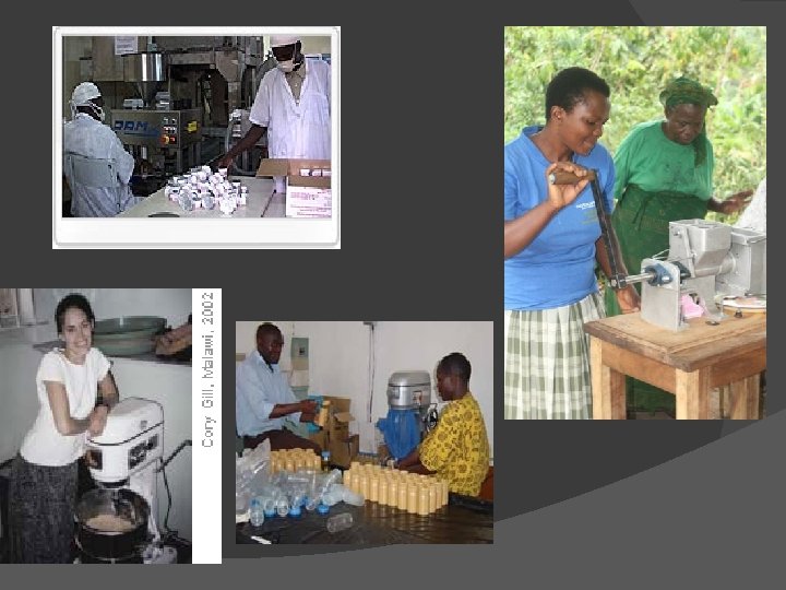 RUFT=Therapeutic Food Local production ↓ cost significantly Local formulations: no milk/peanuts, but local grains + pulses, sesame oil Range of protein content Quality control, aflatoxin contamination Vehicles for probiotics + prebiotics + antioxidants Bind CTC w/ food security/agricultural interventions, local income generation + home based care for AIDS