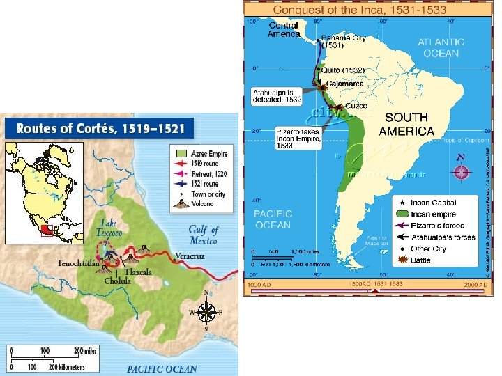 Fall of Aztecs and Inca • 1519 Hernan Cortes, a Spanish conquistador, conquered the Aztec Empire in less than 2 years. • 1532 Francisco Pizarro conquered the Inca Empire in less than 3 years. DUE TO: • Superior technology (guns, cannons, larger ships) • Diseases that the natives were not immune to • Possible belief that the Spanish were Gods