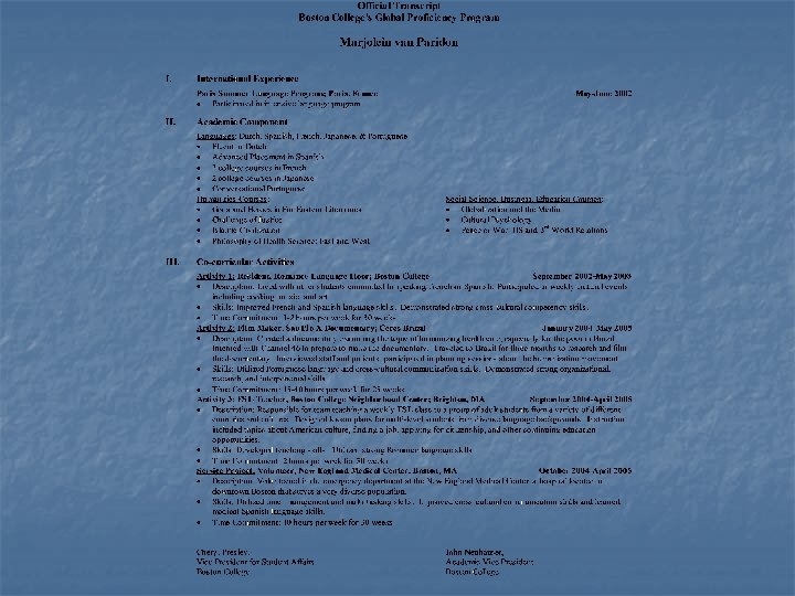 Official GP Transcript n n n Graduates receive an official transcript outlining their experiences and achievements in the GP program. This is signed by BC’s Vice President of Student Affairs and the Provost Resume-like and can be submitted in addition to a resume and cover letter, or graduate school application Makes student stand out as an exceptional applicant to prospective employers, internship opportunities, graduate schools, and volunteer positions
