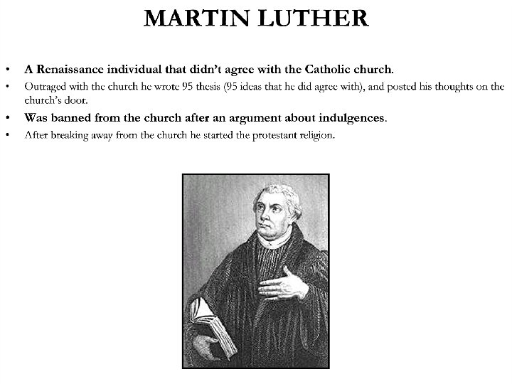 95 Thesis l WHO: Written by Martin Luther l WHAT: Martin Luther posted a list of 95 Theses, or formal statements, that he wrote on the door of a castle church in Wittenberg, l WHERE: Posted them on the door of the castle church in Wittenberg, became known all over Germany l WHEN: October 31, 1517 l WHY: he did those because he did not agree with how a friar named John Tetzel was raising money to rebuild a church in Rome. Tetzel was selling indulgences to people who have sinned, which would release them from performing the penalty.