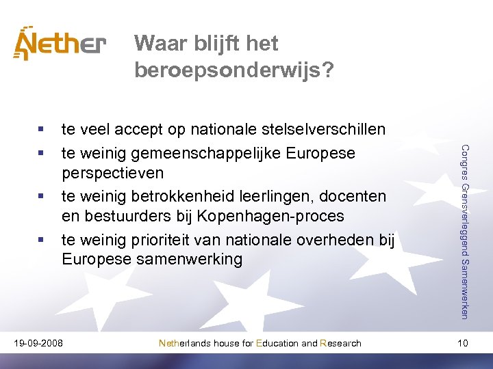 Initiatieven onderwijsvelden § 19 -09 -2008 Netherlands house for Education and Research Congres Grensverleggend Samenwerken § hoger onderwijsruimte (EHEA) via Bolognaproces: stelselconvergentie via Europese instrumenten zoals ECTS Europese ruimte voor mbo (EVETA) via het Kopenhagen-proces: stelselconvergentie? 9