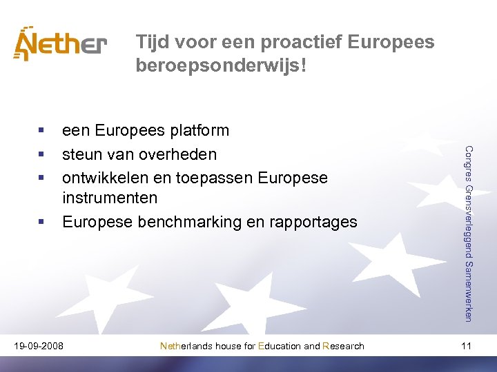 Waar blijft het beroepsonderwijs? § § te veel accept op nationale stelselverschillen te weinig gemeenschappelijke Europese perspectieven te weinig betrokkenheid leerlingen, docenten en bestuurders bij Kopenhagen-proces te weinig prioriteit van nationale overheden bij Europese samenwerking 19 -09 -2008 Netherlands house for Education and Research Congres Grensverleggend Samenwerken § § 10