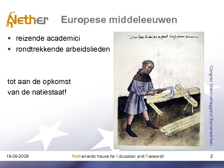 Europese middeleeuwen § reizende academici § rondtrekkende arbeidslieden Congres Grensverleggend Samenwerken tot aan de opkomst van de natiestaat! 19 -09 -2008 Netherlands house for Education and Research 2
