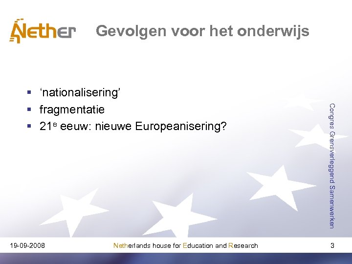 Gevolgen voor het onderwijs 19 -09 -2008 Netherlands house for Education and Research Congres Grensverleggend Samenwerken § ‘nationalisering’ § fragmentatie § 21 e eeuw: nieuwe Europeanisering? 3