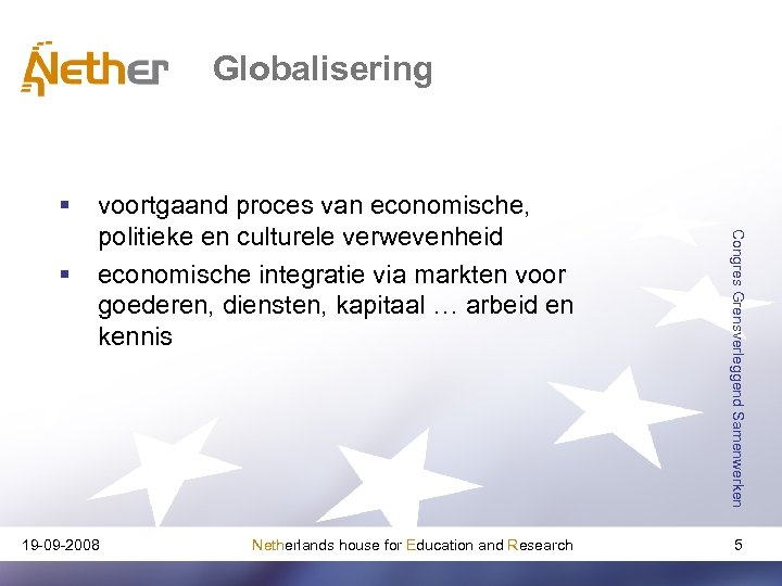 Twee concepten 19 -09 -2008 Netherlands house for Education and Research Congres Grensverleggend Samenwerken 1. globalisering 2. internationalisering 4