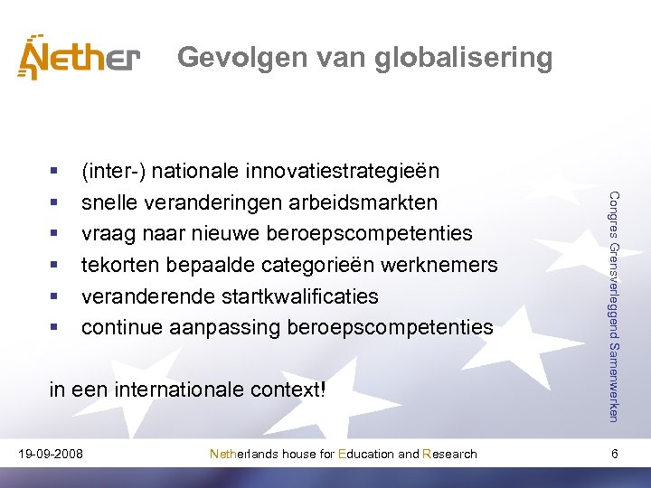 Globalisering § 19 -09 -2008 Netherlands house for Education and Research Congres Grensverleggend Samenwerken § voortgaand proces van economische, politieke en culturele verwevenheid economische integratie via markten voor goederen, diensten, kapitaal … arbeid en kennis 5