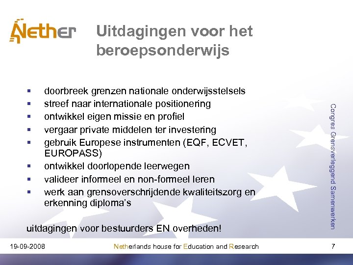 Gevolgen van globalisering (inter-) nationale innovatiestrategieën snelle veranderingen arbeidsmarkten vraag naar nieuwe beroepscompetenties tekorten bepaalde categorieën werknemers veranderende startkwalificaties continue aanpassing beroepscompetenties in een internationale context! 19 -09 -2008 Netherlands house for Education and Research Congres Grensverleggend Samenwerken § § § 6