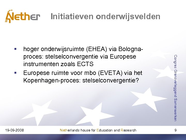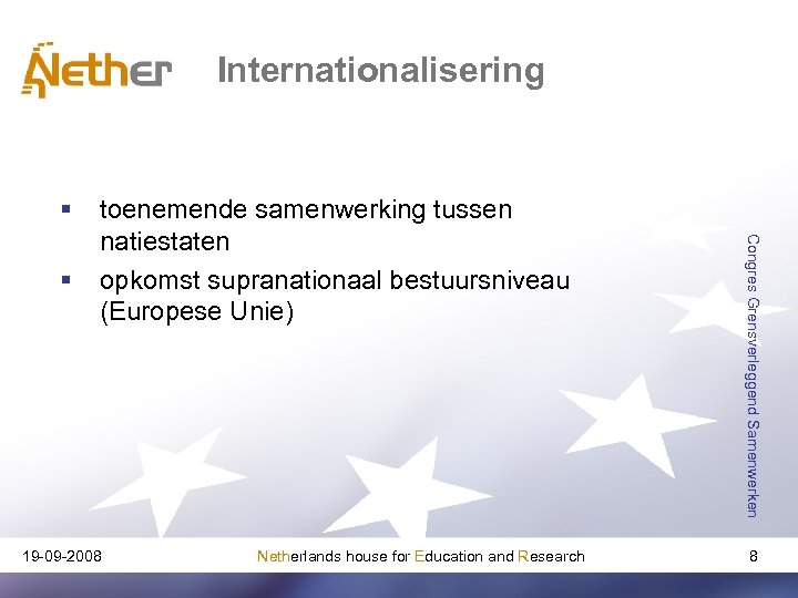 Internationalisering § 19 -09 -2008 Netherlands house for Education and Research Congres Grensverleggend Samenwerken § toenemende samenwerking tussen natiestaten opkomst supranationaal bestuursniveau (Europese Unie) 8