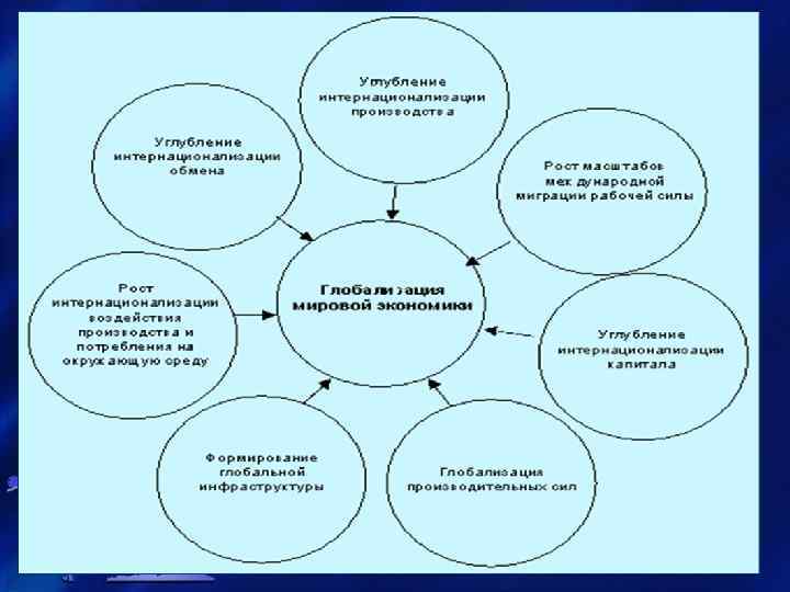 Углубление интернационализации производства Углубление интернационализации обмена Влияние Производства на окр. среду Глобализация мировой экономики Формирование глобальной инфраструктуры Рост масштабов междунар. Миграции Раб. силы Углубление Интернационализации капитала Глобализация производительных сил
