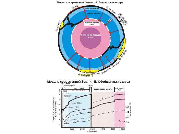 Разрез Земли с показом крупных элементов ее поверхности. Составил А. М. Никишин с использованием данных в (Twiss, Moores, 1992)