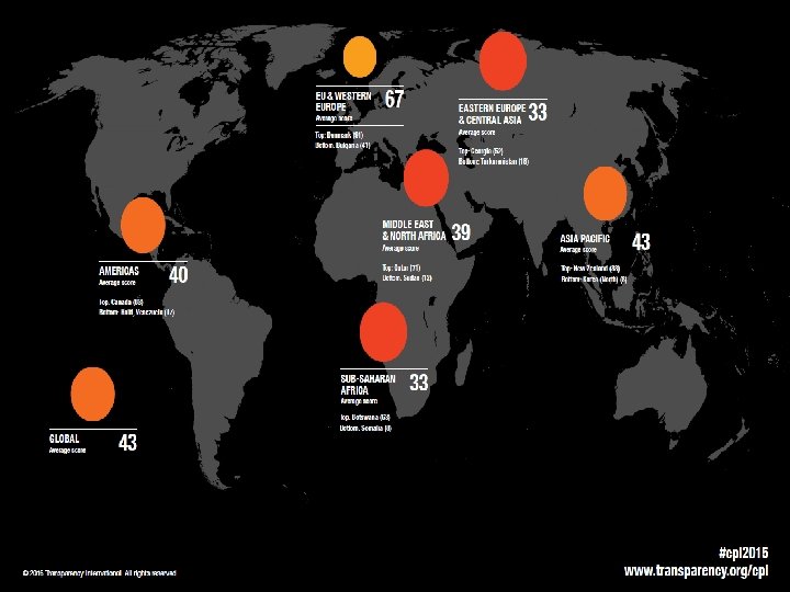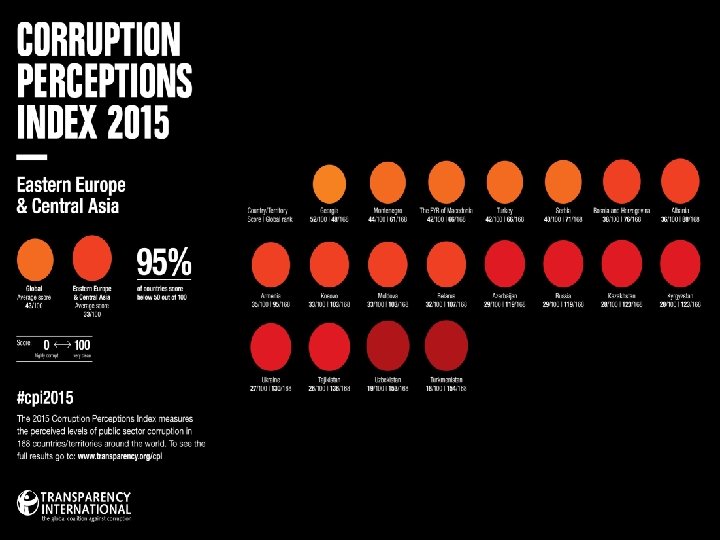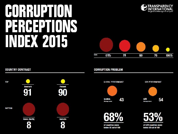 CPI 2015 - Najbolje i najlošije rangirani Zemlje percipirane kao najmanje korumpirane Rang Zemlja Skor (0 -100) Br. istraživanja 1 Danska 91 7 2 Finska 90 7 3 Švedska 89 7 4 Novi Zeland 88 7 Zemlje percipirane kao najkorumpiranije Rang Severna Koreja Skor (0 -100) 8 Somalija 8 4 166 Avganistan 11 4 165 Sudan 12 6 167 Zemlja Br. istraživanja 3