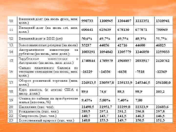 Висновки • Проаналізувавши макроекономічну ситуацію в Австралії , можна зробити висновок , що стана одна з передових країн світового господарства. По більшості позитивних показників країна входить в 10 чи як найменше в 20 лідерів. По більшості показнику Австралія випереджає країни світу , які вважають найрозвиненішими. Для збільшення зростання населення Австралії , так як вона займає 70 місце , варто активізуватися в массмедія для залучення населення , хоча і так країна посідає перше місце в світі з міграції. Забезпечити стимули для підвищення народжуваності серед місцевого населення.