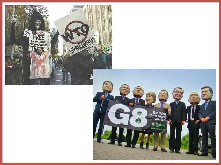 ПЛЮСЫ И МИНУСЫ ГЛОБАЛИЗАЦИИ + • открываются дополнительные возможности и немалые выгоды отдельным странам • достигается экономия на издержках производства • оптимизируется размещение ресурсов в мировом масштабе • расширяются ассортимент, повышается качество товаров на национальных рынках • становятся широко доступными достижения науки, техники и культуры • ТНК играют положительную роль в создании современных производств в развивающихся странах - • переход значительной части контроля над экономикой от суверенных государств к транснациональным корпорациям и международным организациям, у которых свои и нередко противоположные национальным интересы • программы либерализации и структурной адаптации, рекомендуемые ряду стран международными организациями, в возрастающей степени подчиняют внутреннюю социальную политику внешним экономическим силам • замедление общемирового прогресса по многим направлениям