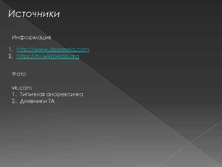 Источники Информация 1. http: //www. depressia. com 2. https: //ru. wikipedia. org Фото vk. com 1. Типичная анорексичка 2. Дневники ТА