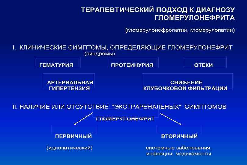 Клинические синдромы - Нефритический - Нефротический - Изолированный мочевой - БПГН По течению - Острый - Хронический - Быстропрогрессирующий По функции почек - С сохранной функцией почек - Со снижением функции почек - Почечная недостаточность