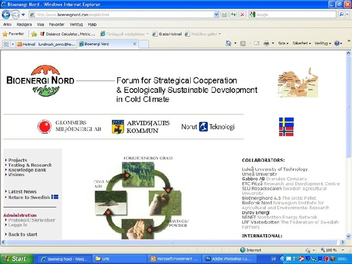 GME in collaboration with Arvidsjaur kommun completed seven biofuel projects 1997 -2008: (you can find all project reports on www. bioenerginord. com ) 1. KAB – An inventory of the biofuel potential of the local district (1997 -1999). 2. Reed Canary Grass – Energy grass cultivation on peat soil land in collaboration with the Swedish Agricultural University. 3. Marketing and information to the public about biofuel pellets. 4. Inventory of the ash and sludge quantaties of Northern Sweden (for possible use as a fertilizer) 5. The construction of a Biofuel Test Station 6. Inventory and analysis of commercial use of White Hardwood (2005 -2007) 7. Lifecycle-based bioenergy in Cold Climate (2006 -2008)