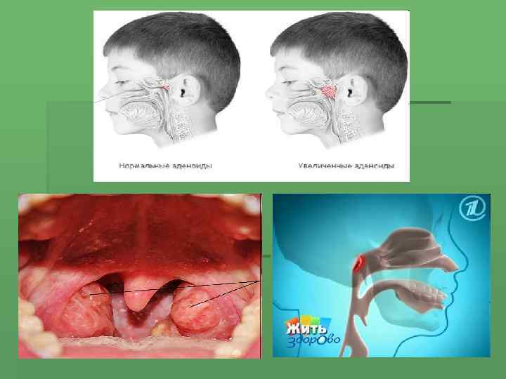 Ускладнення Глотковий мигдалик порушує прохідність слухових труб та є місцем розмноження мікроорганізмів, аденоїди стають причиною ряду ускладнень: 1. 2. 3. 4. 5. 6. 7. 8. 9. • Хронічний риніт. • Гострі чи хронічні синусити. • Гострий рецидивуючий чи хронічний гнійний середній отит. • Хронічний тубоотит. • Хронічний тонзиліт. • Хронічний фарингіт. • Ларинготрахеобронхіт. • Кон’юнктивіт. • Запалення шийних лімфовузлів тощо.