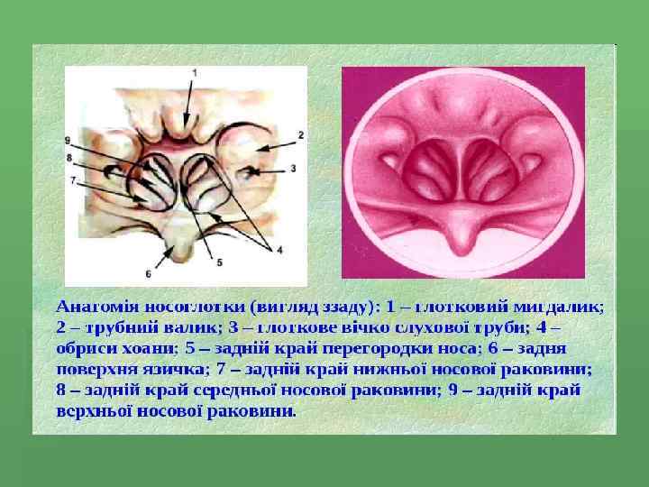 Носоглотка (верхня частина глотки) – порожнина, що знаходиться позаду від порожнини носа та сполучається з нею через праву та ліву хоани.