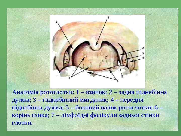 § Між піднебінними дужками з обох боків розташовані піднебінні мигдалики (правий і лівий). На їх поверхні, звернутій у порожнину зіва, є чисельні глибокі розгалужені щілини – лакуни (або крипти). § У товщі слизової оболонки задньої та бокових стінок глотки є невеликі скупчення лімфоїдної тканини, що називаються лімфоїдними фолікулами задньої стінки та бокових валиків глотки. § На задній поверхні кореня язика розташоване ще одне скупчення лімфоїдної тканини – язиковий мигдалик.