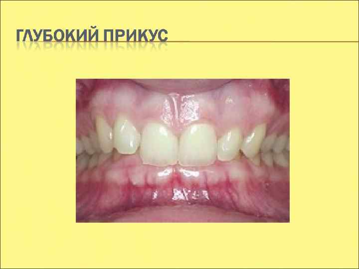 ПРОЯВЛЕНИЕ ГЛУБОКОГО ПРИКУСА При глубокой резцовой окклюзии происходит полное (или почти полное) перекрытие верхними фронтальными зубами нижних. В некоторых случаях перекрытие настолько глубокое, что верхние фронтальные зубы контактируют с десной нижней челюсти, приводя к ее хронической травме. Диагноз ставится приблизительно и не заменяет консультации в кабинете стоматолога.