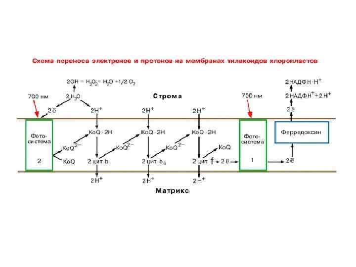 Z — донор электронов для ФС II, P 680 — энергетическая ловушка и реакционный центр ФС II(светособирающая антенна этого центра включает молекулу хлорофилла а, хлорофилла b, ксантофиллы), Q — первичный акцептор электронов в ФС II, АДФ — аденозиндифосфат, Pнеорг. — неорганический фосфат, АТФ — аденозинтрифосфат, Р 700 — энергетическая ловушка и реакционный центр ФС I (светособирающая антенна этого центра включает молекулу хлорофила а, хлорофилла b, каротин), ВВФ — вещество, восстанавливающее ферредоксин.